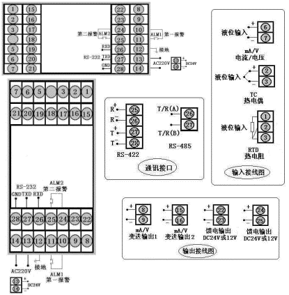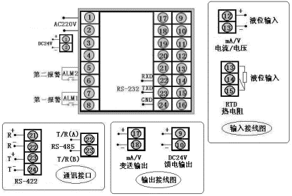 帶控制(或報警)輸出液位?容積控制儀,輸入類型為4~20mA,繼電器控制輸出,帶RS-485通訊,帶上下限繼電器報警輸出,帶DC24V饋電輸出。