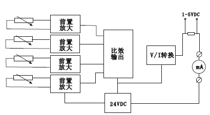 ◆自熱電阻傳感器的測量信號通過前置放大器放大,然后被比較輸入電路(選擇高溫信號)或選點(diǎn)輸入電路選中某一路信號,該信號通過電壓/電流(V/I)轉(zhuǎn)換單元將放大器的輸出電壓變?yōu)?-20A恒定電流輸出,原理方框圖如下圖所示: